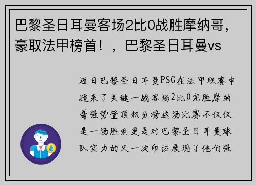 近日,巴黎圣日耳曼(PSG)在法甲联赛中迎来了关键一战,客场2比0完胜摩纳哥,强势登顶积分榜。这场比赛不仅仅是一场胜利,更是对巴黎圣日耳曼球队实力的又一次印证,展现了他们强大的竞争力和不容忽视的统治力。