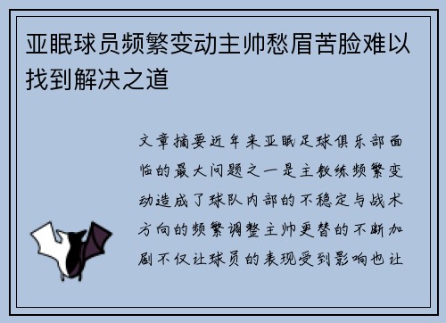 亚眠球员频繁变动主帅愁眉苦脸难以找到解决之道